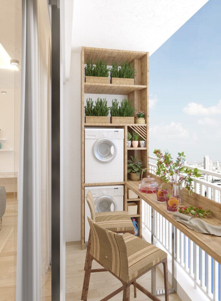 Ban công thường bị bỏ phí hoặc trở thành nơi chứa đồ ngổn ngang. Việc thêm một hộp chứa có nắp hoặc tủ nhỏ ngoài trời sẽ giúp bảo quản dụng cụ làm vườn, đồ phơi sấy. Nếu yêu thích cây xanh, giá treo đa tầng vừa tạo mảng xanh vừa giữ lối đi thông thoáng.