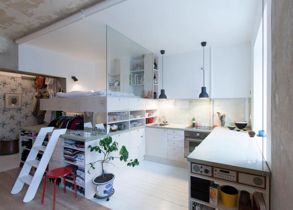 Một căn studio 30m² cho người độc thân có thể giải quyết bằng giường loft để tạo không gian làm việc bên dưới, sofa hộc chứa và kệ TV treo tường cao.
