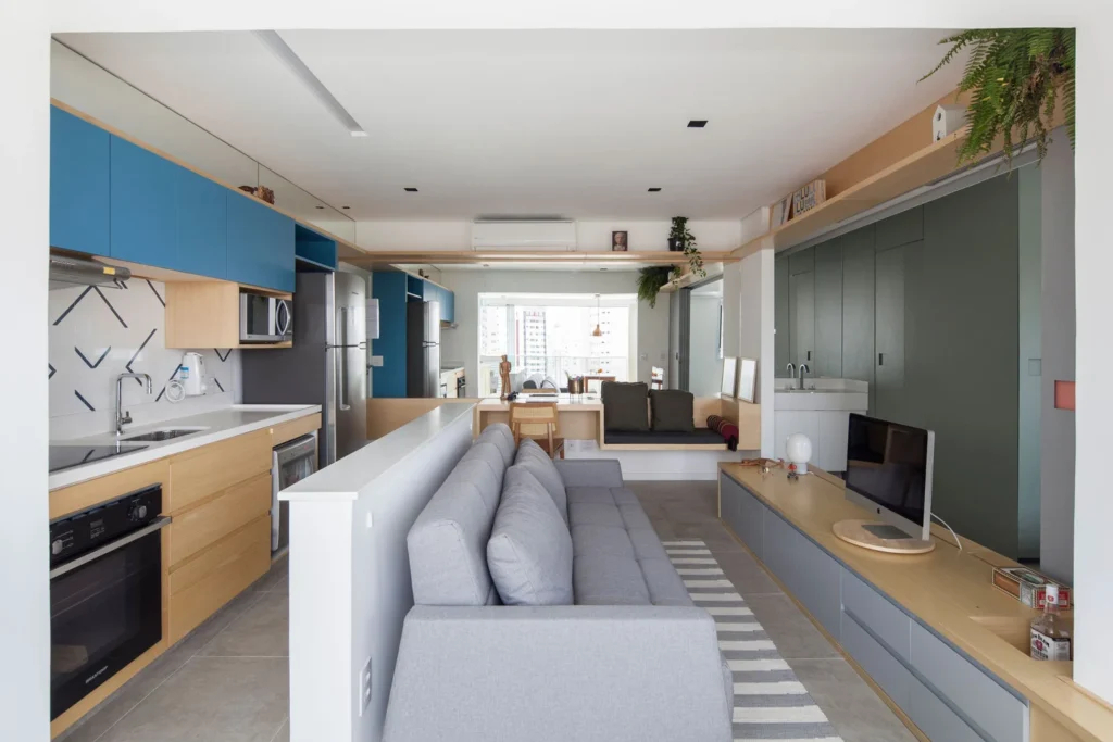 Phòng khách của căn hộ nhỏ thường phải kiêm nhiều chức năng: tiếp khách, giải trí, thậm chí là làm việc. Một chiếc sofa có ngăn chứa bên dưới là nơi hoàn hảo để cất chăn gối hoặc sách báo. Kệ TV nên kết hợp cả ngăn kín để giấu đồ điện tử, dây cáp, và hộc mở để trưng bày vật trang trí. Bàn cà phê có hộc kéo hoặc mặt nâng giúp giữ cho bề mặt luôn gọn gàng mà không mất tiện dụng. Nên ưu tiên đồ nội thất thấp để không che khuất tầm nhìn và để ánh sáng tự nhiên lan tỏa khắp phòng.