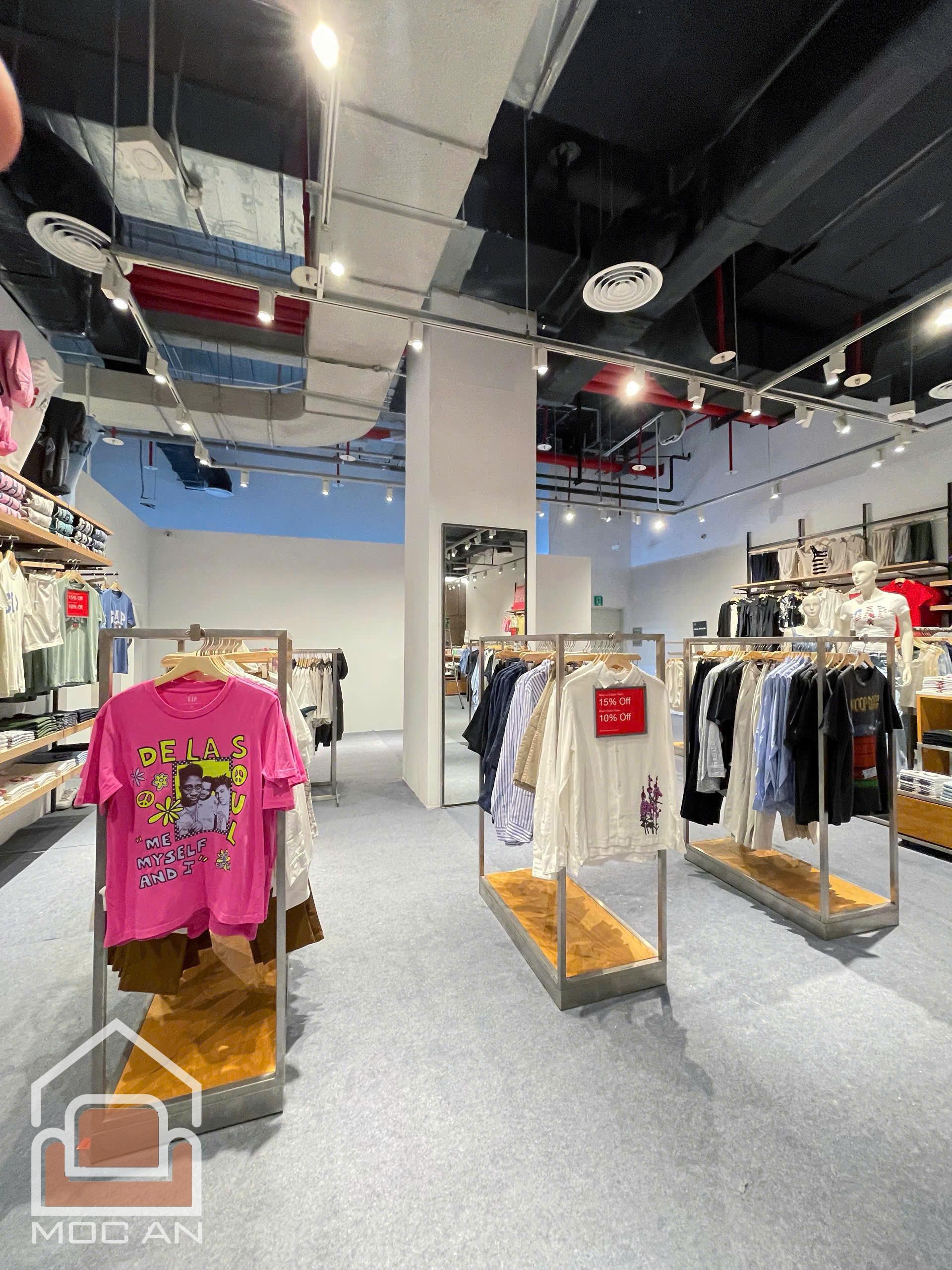 Bước vào cửa hàng, khách hàng sẽ cảm nhận ngay sự rộng rãi, thoáng đãng nhờ cách sắp xếp mặt bằng khoa học. Khu vực áo thun, hoodie được đặt ngay tầm mắt trên hệ kệ gỗ kết hợp khung sắt sơn tĩnh điện, vừa chắc chắn vừa mang tính thẩm mỹ. Trung tâm cửa hàng là các bàn trưng bày sản phẩm gấp gọn, được sắp xếp theo màu sắc, kích cỡ, giúp khách dễ dàng tìm kiếm. Xen kẽ là các mannequin mặc sẵn trang phục gợi ý, tạo cảm hứng phối đồ và thu hút ánh nhìn.