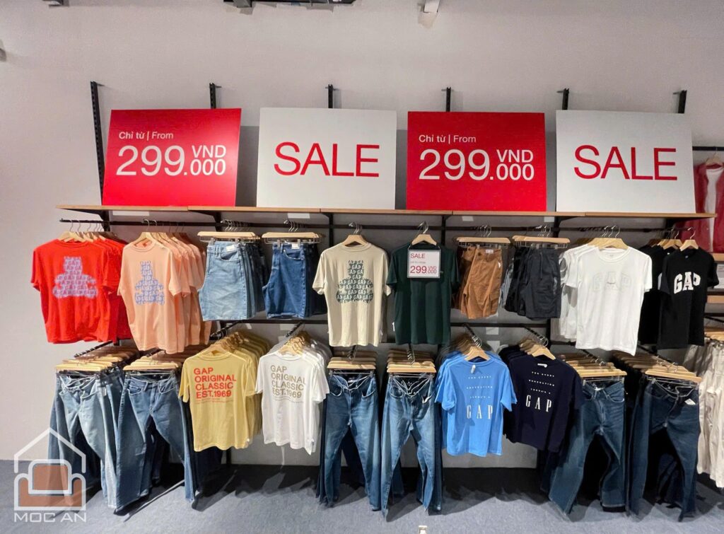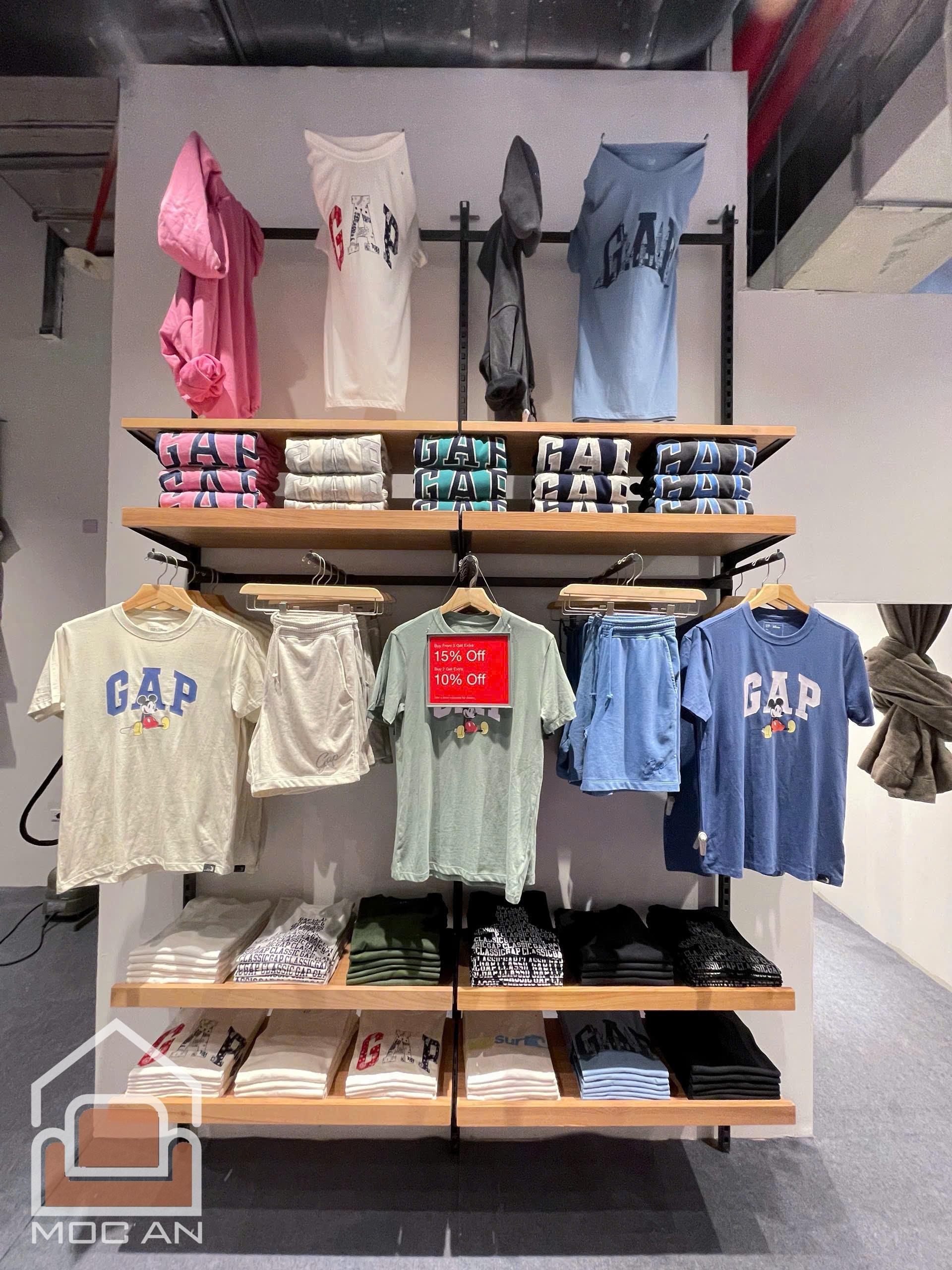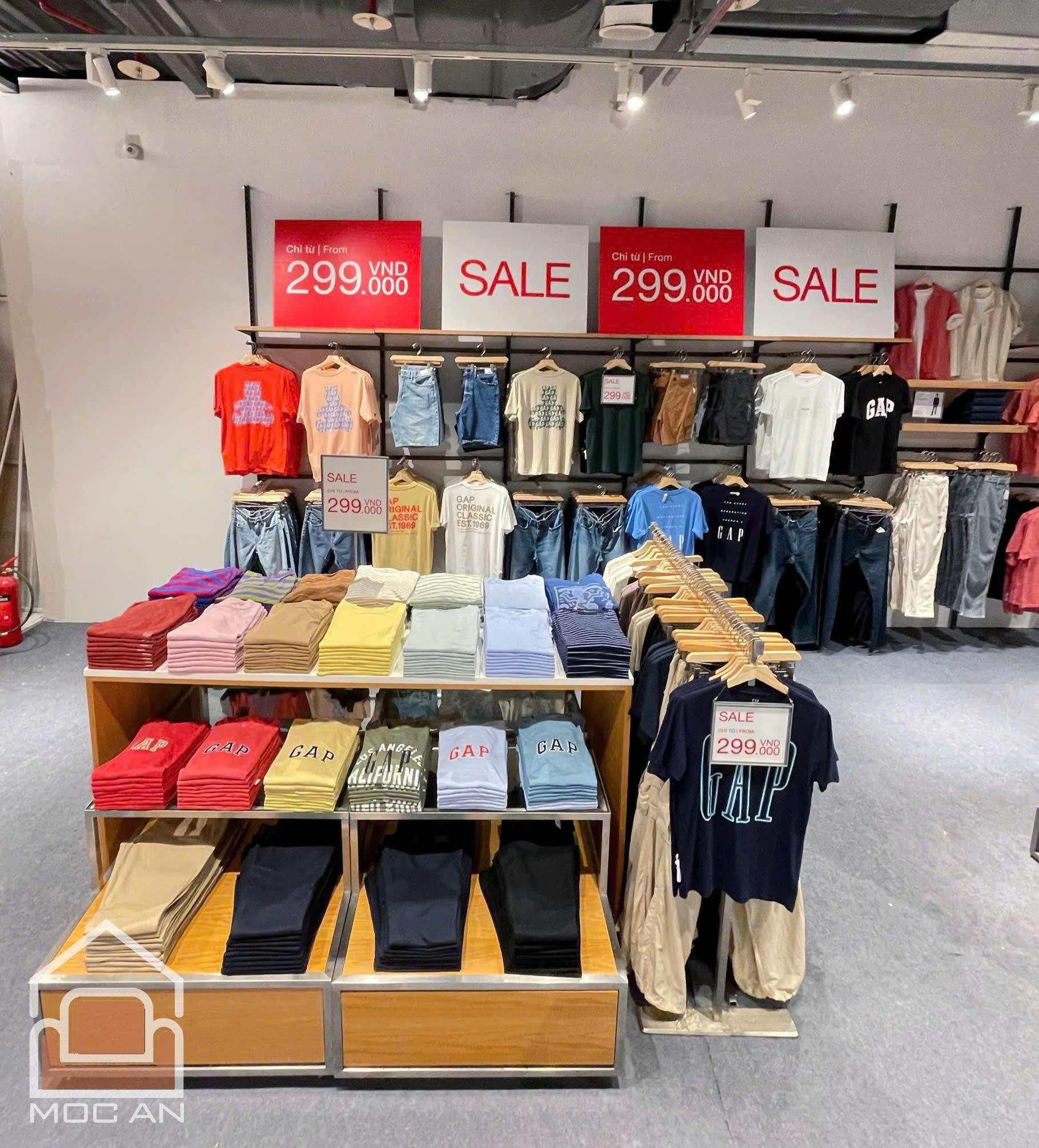 Tông trắng chủ đạo trên tường giúp làm nổi bật sản phẩm, trong khi các biển hiệu giảm giá màu đỏ và màu sắc đặc trưng của GAP trên áo quần tạo nên điểm nhấn thương hiệu mạnh mẽ. Tất cả sản phẩm được gấp, treo và sắp xếp đồng bộ, tạo cảm giác chuyên nghiệp, gọn gàng và nhất quán.