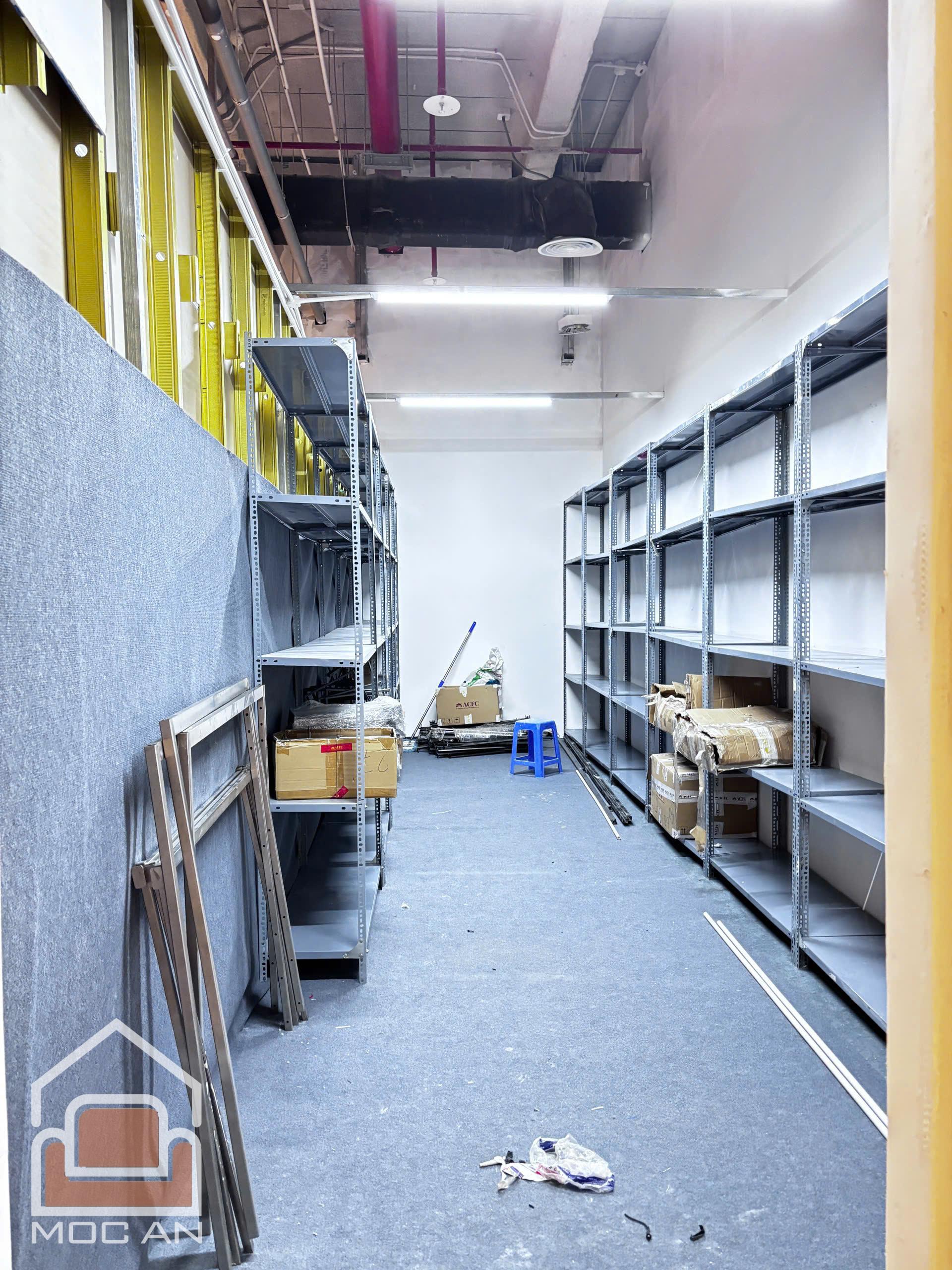 Mộc An Interior chú trọng từng chi tiết trong lựa chọn chất liệu. Kệ gỗ công nghiệp phủ melamine tông màu ấm kết hợp với khung kim loại đen tạo nét hiện đại và bền bỉ. Giá treo inox mạ màu vừa đẹp vừa chịu lực tốt, đảm bảo khả năng sử dụng lâu dài. Thảm sàn tối màu vừa tạo sự sang trọng vừa giữ cho không gian luôn sạch sẽ.