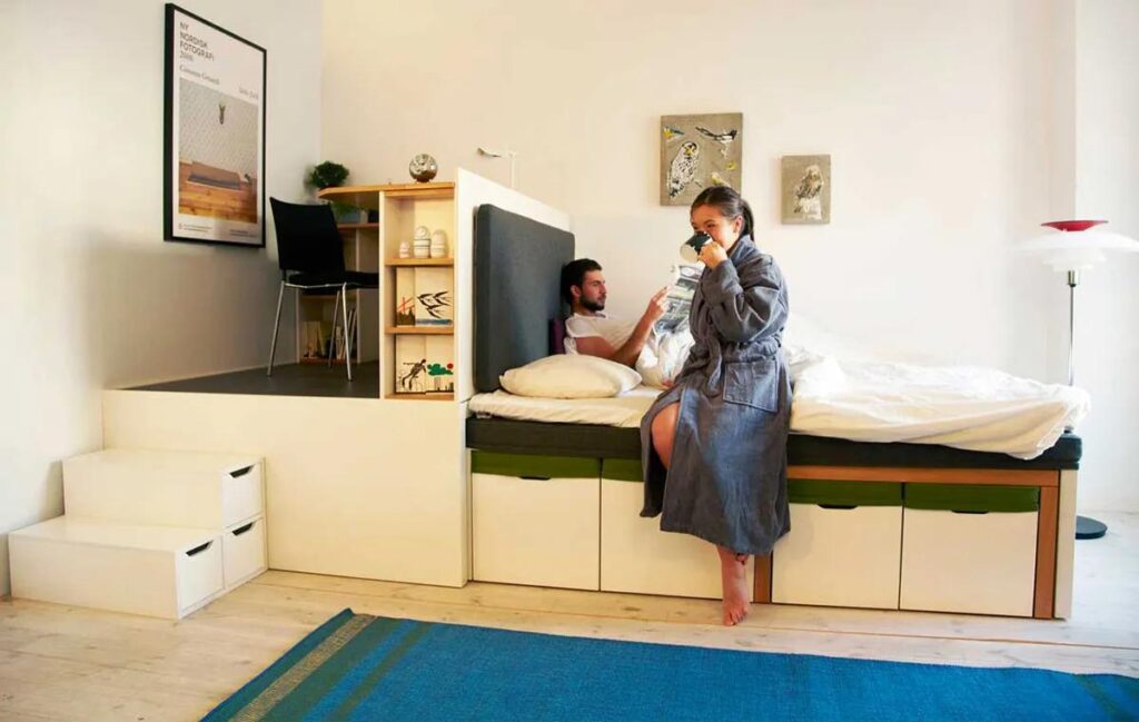 Module bàn ghế và giường cũng rất linh hoạt. Các bộ bàn ăn, bàn làm việc, ghế sofa hay giường ngủ có thể mở rộng, gập lại, hoặc kết hợp nhiều chức năng trong một sản phẩm. Một số thiết kế giường modular hiện đại còn tích hợp ngăn kéo, bàn làm việc, hoặc kệ sách, giúp tiết kiệm diện tích đáng kể.